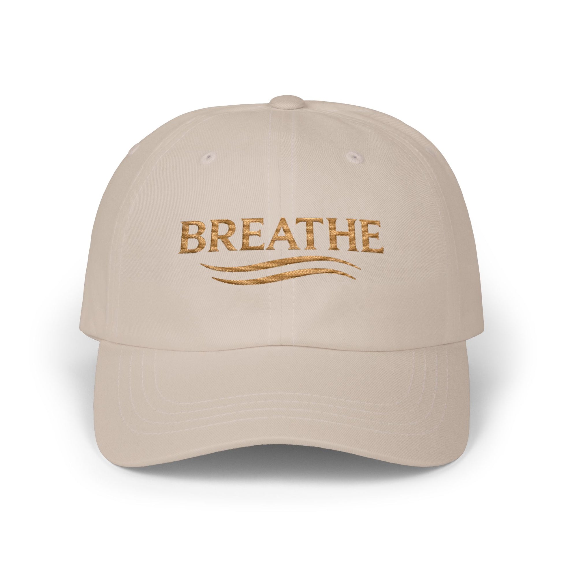 Diese Baumwoll-Cap trägt das Wort „BREATHE“ in warmem, strukturiertem Goldfaden – über einem sanften Wellenmotiv, das Ruhe und Balance ausstrahlt.